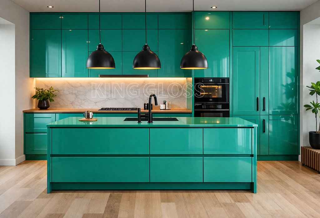 ورق MDF پلی گلاس فیروزه‌ای براق کینگ گلاس | سطح مقاوم در برابر حرارت و آنتی فینگر با ضد لک، مناسب برای کابینت آشپزخانه، فضای تجاری مدرن